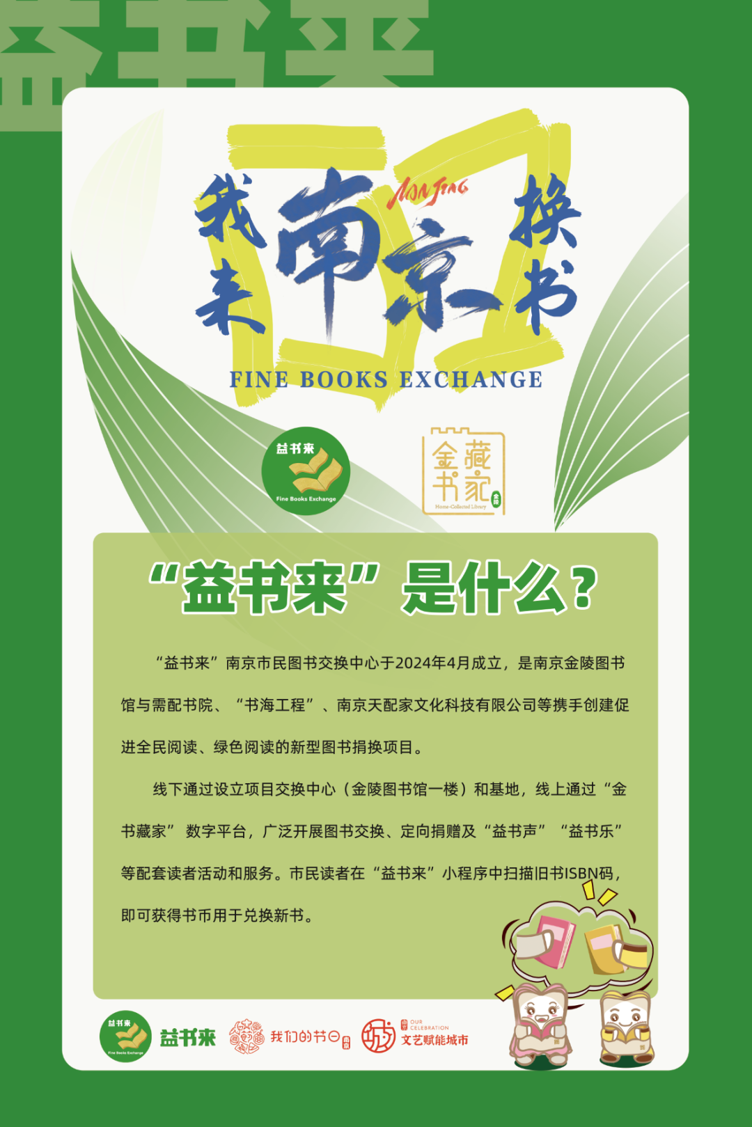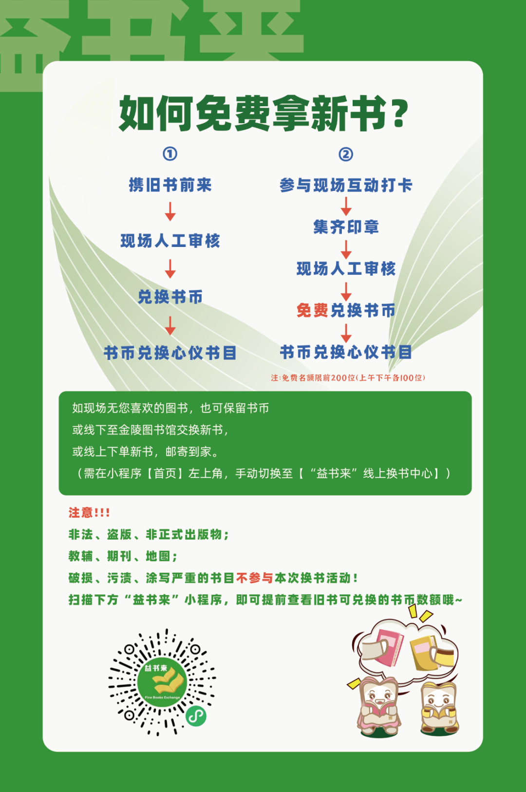本场活动的核心大礼来自“益书来”阅读服务项目。“益书来”是金陵图书馆继成功打造“朗读者”、南京共享图书馆、“书服到家”“阅美四季”等阅读服务品牌之后,创新推出的又一项阅读服务项目。“益书来”其意有二:一是作为公共图书馆和读者,都渴望能拥有优质的书籍,让好书充盈书库、滋润心灵;二是“益”谐音“易”,强调交换之意,通过好书的换入换出,形成知识流动的美好循环。希望借助这一平台,让图书资源得到更加有效地利用,吸引读者参与到图书交换的行列中来,共同分享阅读的乐趣。读者只需利用“益书来”小程序扫描家中旧书ISBN码,就能够获知旧书可兑换价值。在现场兑换过程中,将旧书兑换成相应的书币,进而用这些书币兑换成新书。此外,“益书来”还贴心推出线上服务——“金书藏家”图书交换数字平台,提供线上选书兑换、邮寄到家服务。