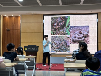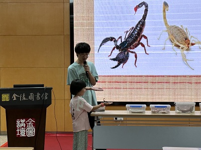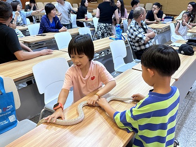 旧山(杜思凯)老师的讲座图文并茂,浅显易懂。期间,他还积极与现场市民读者进行问答和互动。此外,为了让科普讲座更加生动有趣,他还特意带来了蝎子、蛇、蜘蛛和蜥蜴等活体生物,帮助市民读者揭开“五毒”的神秘面纱,解锁这些古老生物的奥秘,探索生物的多样性。