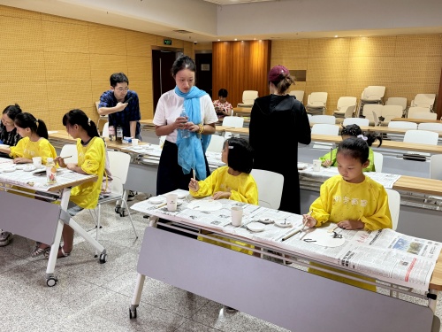 老师分发好材料后,指导大家在团扇上临摹齐白石的作品。孩子们仔细地勾勒每一片荷叶和每一朵荷花,力求表现出荷花的娇艳与清新,试图从中领悟到大师的创作智慧和艺术魅力。在大家的努力下,一幅幅精美的作品逐渐呈现在眼前。