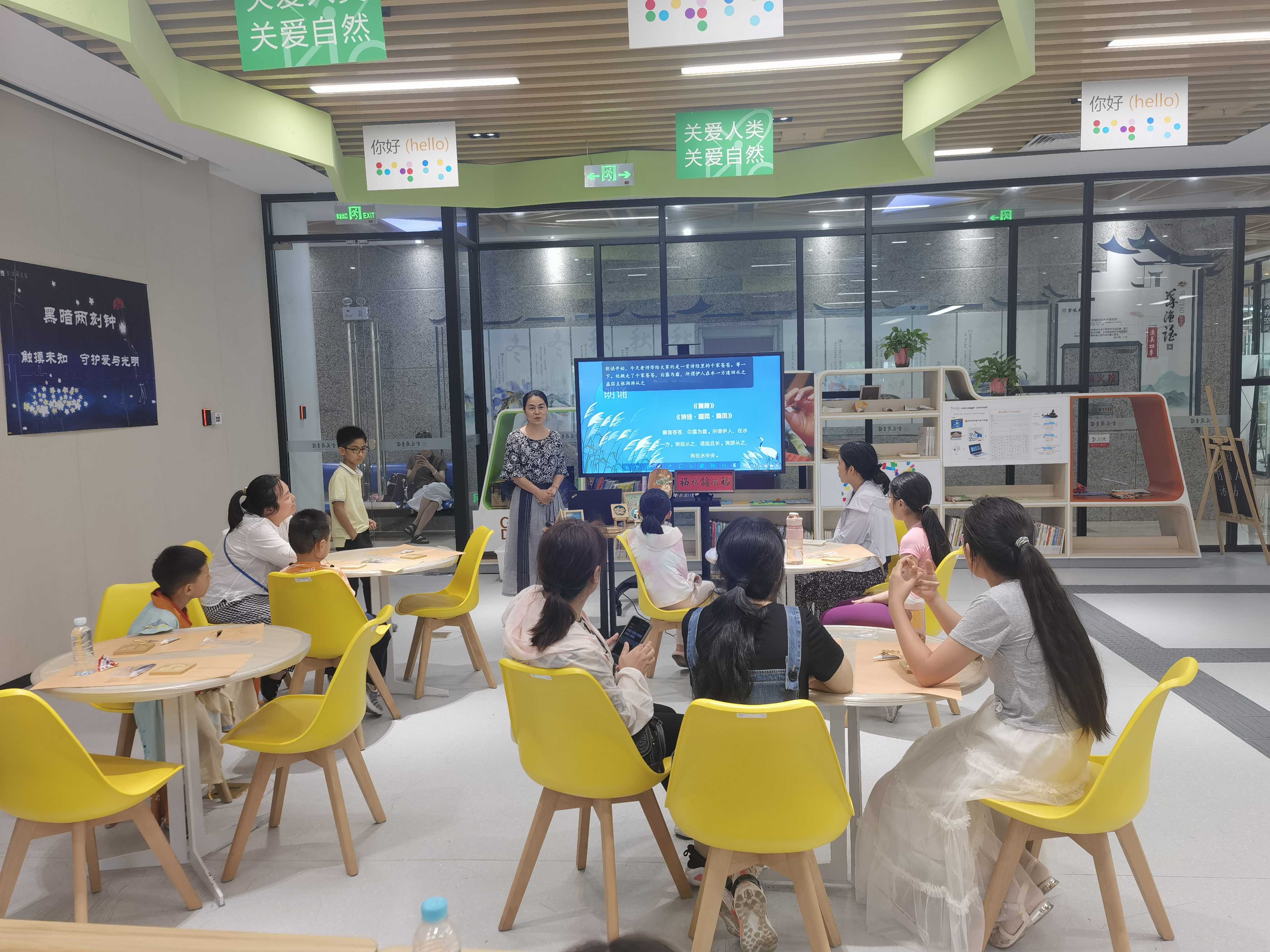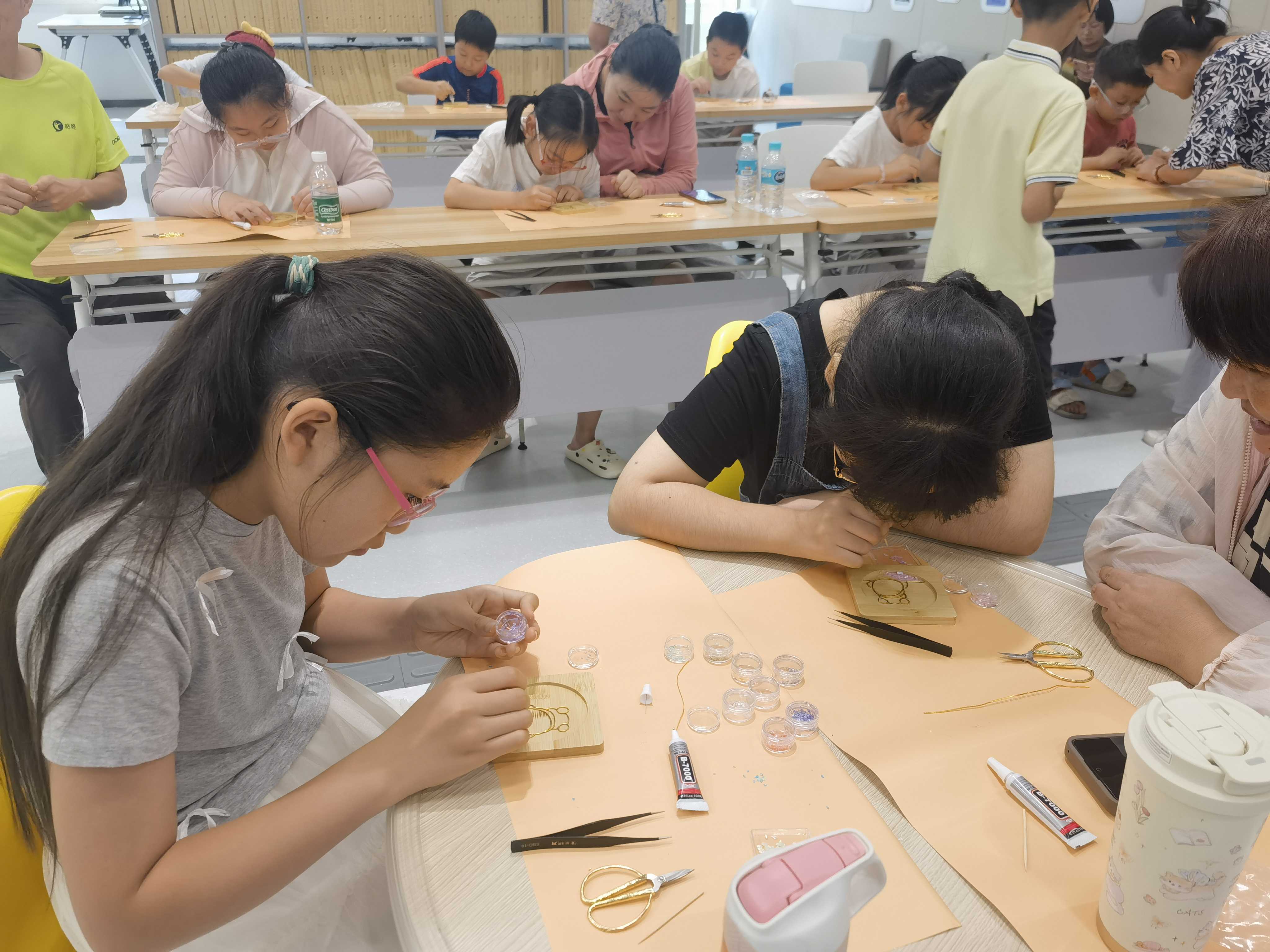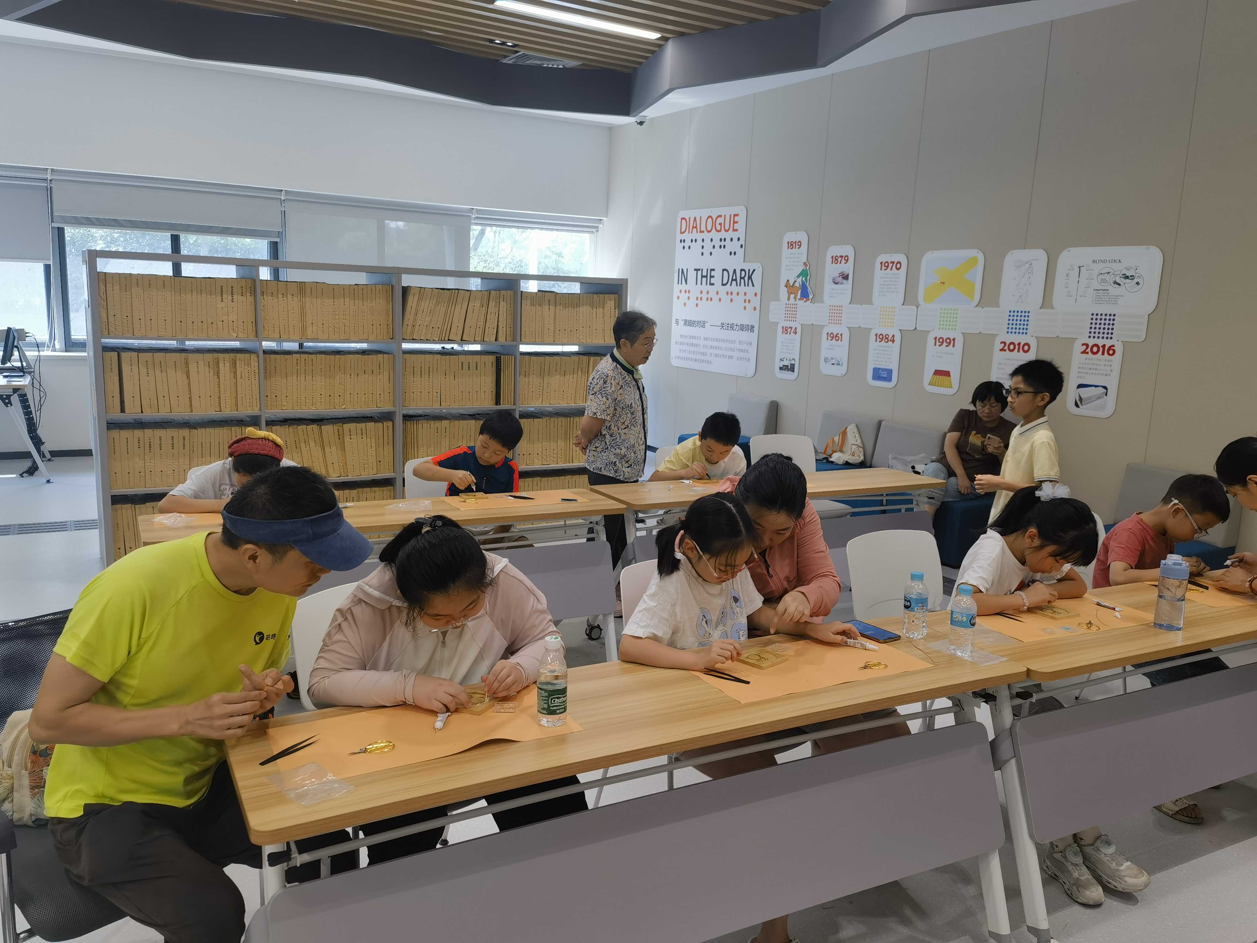 9月7日,金陵图书馆“指尖寻光”非遗手工普特融合阅读课程系列课第三期开课,听障儿童与普通儿童共同完成掐丝珐琅和螺钿工艺结合的手工品。