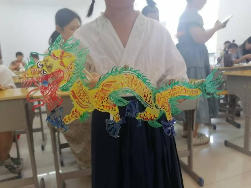 皮影制作的最后一步是给皮影上色。这一环节中,大家并不拘泥于平常皮影的色彩构图,发挥想象、大胆创作,在皮影龙上绘制了自己喜欢的色彩。上色完成之后便是装杆操作,孩子们兴致盎然,一个个皮影在孩子们的手中“活”了起来。