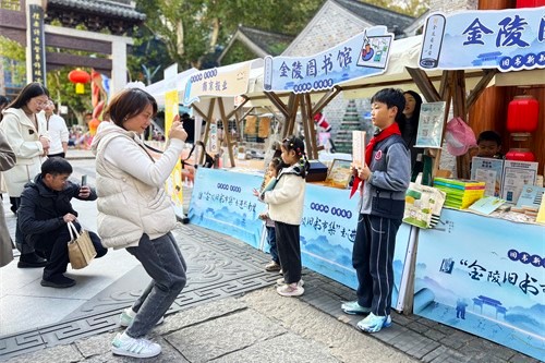 金陵图书馆作为国家一级图书馆、全国古籍重点保护单位,近年来通过各种方式积极征集南京地方文献线装古籍,现有馆藏古籍五万余册,善本三千余册。其中,馆藏图书《檀弓》《考工记》《音学五书》更是入选第一批国家珍贵古籍名录。活动现场,这些珍贵古籍的仿本被一一展出,大量市民游客驻足观看,一睹“真”容。此外,“宁宁”“图图”吉祥物周边、“水滴石穿”“琢石成玉”特色印章、“阅美四季”原创自制绘本等众多图书馆文创产品也在花车摊位上同步展出。