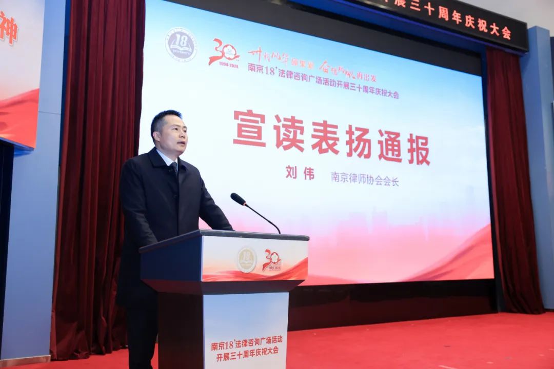 刘伟会长宣读了《关于表扬在南京18'法律咨询广场活动中作出贡献单位和个人的决定》。