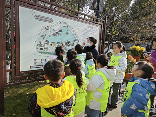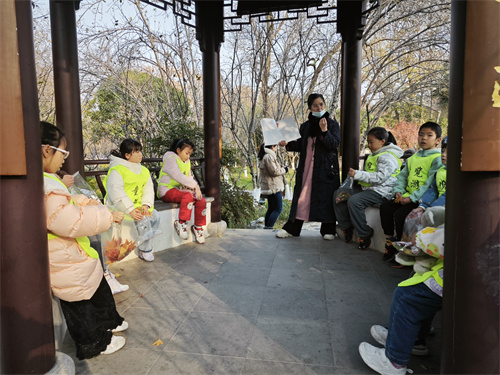 活动当天,阳光明媚,参与的家庭满怀期待地来到莫愁湖公园。莫愁湖,位于南京秦淮河西,莫愁湖景区是一座有着1500年悠久历史和丰富人文资源的江南古典名园,为六朝胜迹。在这个初冬的季节,红枫、银杏、梧桐、垂柳交织成景,形成了一幅宁静而纯粹的动人画卷。老师带领孩子们漫步在莫愁湖畔,讲述着莫愁湖的前世今生,从六朝胜迹到现代公园,每一个历史变迁都充满了传奇色彩。