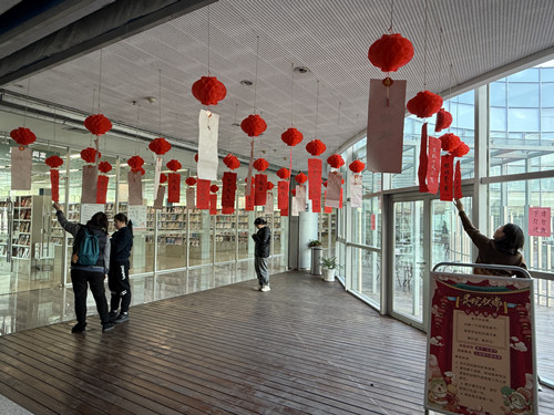 2024年12月4日,“春节”被列入联合国教科文组织人类非物质文化遗产代表作名录。2025年也成为首个“非遗版”春节。作为中国人最隆重、最热闹且象征团圆和希望的节日,春节在中国人心中有着无可比拟的重要地位。为筹备此次灯谜竞猜活动,图书馆工作人员精心准备了40余条谜语,每条谜语都像一件艺术品,用喜庆的红色信纸和传统毛笔书写,再通过寓意吉祥的灯笼悬挂在三楼大厅中。这些谜语既有与新年生肖“蛇”相关的谜题,也有与图书馆报刊相关的谜面,巧妙地融合了传统文化与新春元素,兼具趣味性、知识性和教育意义。活动现场,读者们围聚在灯谜前,有的低头沉思,有的热烈讨论,沉浸在这一场文化盛宴中。一位读者表示:“一边猜灯谜一边学习知识,感觉更有趣了。而且还能和大家一起讨论,热热闹闹的,年味儿一下子就浓了。”