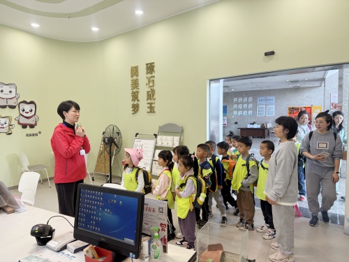 孩子们在水滴大厅集合,有序分成两组,然后在少儿工作部两位老师的带领下,参观了图书馆一楼部分区域:办证处、阅·荐空间、视障人士阅览室、检索区、童·阅空间。很多小朋友都是第一次来到金陵图书馆,对一切都充满了好奇和求知欲。在视障人士阅览室里,孩子们在老师的引导下闭上眼睛,用指尖轻触盲文书籍,用心感受视障人士对阅读的渴望和对知识的渴求;他们观察着视障小朋友的手工作品,充分表达着自己的赞扬,并且表示以后也想参加到相关活动中去。在童·阅空间里,老师们向大家介绍了图书的分类规则、图书架位的布局以及图书消毒机的使用方法,并且现场演示了自助借还机的操作。