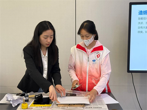 活动还特别设置了非遗体验环节,孩子们通过雕版印刷技艺,亲手制作了金陵图书馆限定版“科学的南京”logo。在体验传统文化魅力的同时,老师引导孩子们思考造纸工艺带来的水污染问题,深化了他们对水资源保护的认知。