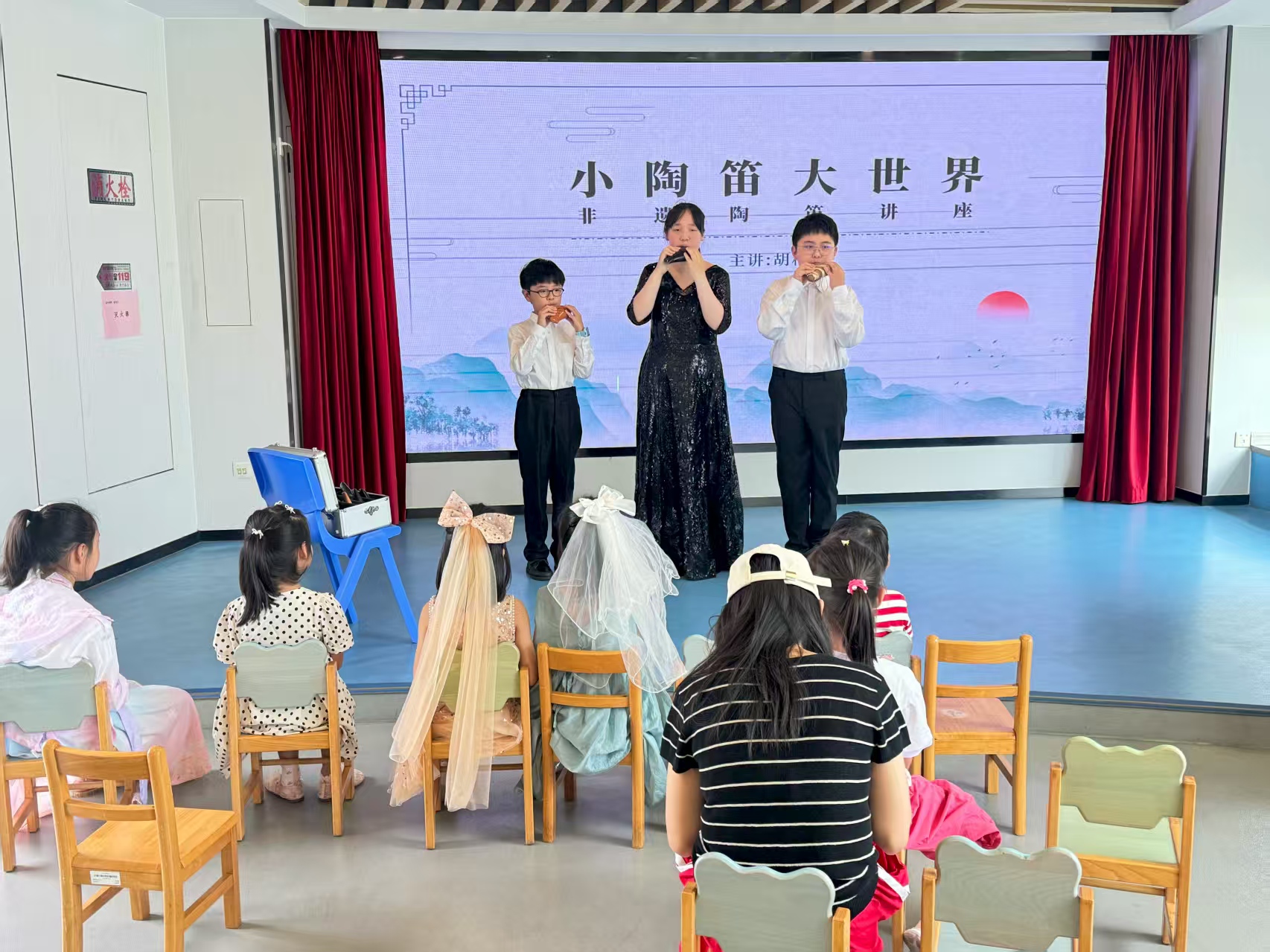 随后,活动进入了最令人期待的环节——小小演奏家们的精彩表演。他们依次登台,为我们带来了一场听觉盛宴。有诙谐欢快的《布谷鸟》,清脆悦耳的笛声仿佛将我们带到了春意盎然的田野;有《大鱼》的悠扬旋律,那空灵婉转的音色让人沉醉;《留住你灿烂的笑容》则以其温暖的曲调触动了在场每一位听众的心弦。压轴登场的是三位小演奏家的合奏《哪吒》,他们默契的配合和精湛的技艺将这首经典曲目演绎得淋漓尽致,赢得了全场热烈的掌声。每一首风格迥异的乐曲都如同一个动人的故事,通过陶笛独特的音色娓娓道来,为现场观众带来了难忘的艺术享受。大家都屏息凝神,沉浸在美妙的音乐世界中,用心感受着这件古老乐器所传递的艺术魅力。