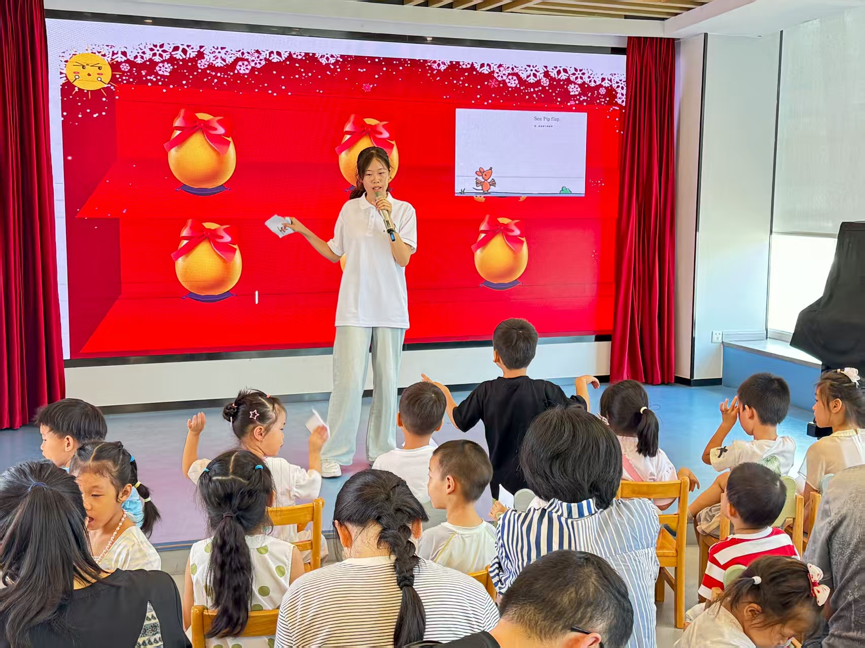 活动伊始,老师通过播放大家熟悉的动画片段来引入故事内容,直观生动的导入方式立即吸引了所有孩子的注意力。在讲解过程中,重点教授了"see""flop""fly"等与故事内容紧密相关的核心词汇,通过夸张的肢体动作和丰富的表情,帮助孩子们快速理解并记住这些单词。
