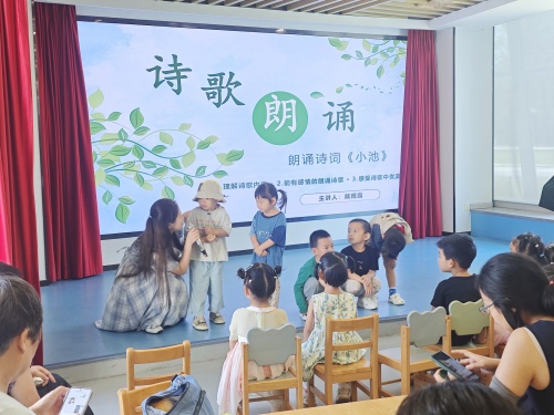 本期活动的重头戏是宋代诗人杨万里的《小池》。露露老师用生动形象的语言,为小朋友们描绘诗中的夏日美景。通过逐句赏析,小朋友们不仅理解了诗句的含义,更在老师的引导下展开想象,感受诗人笔下那份对夏日自然的细腻观察和真挚情感。在掌握了朗诵技巧后,小朋友们一个个自信地走上舞台,抑扬顿挫、声情并茂地朗读这首诗。他们用稚嫩却真挚的声音,将这首流传千年的夏日诗篇娓娓道来。