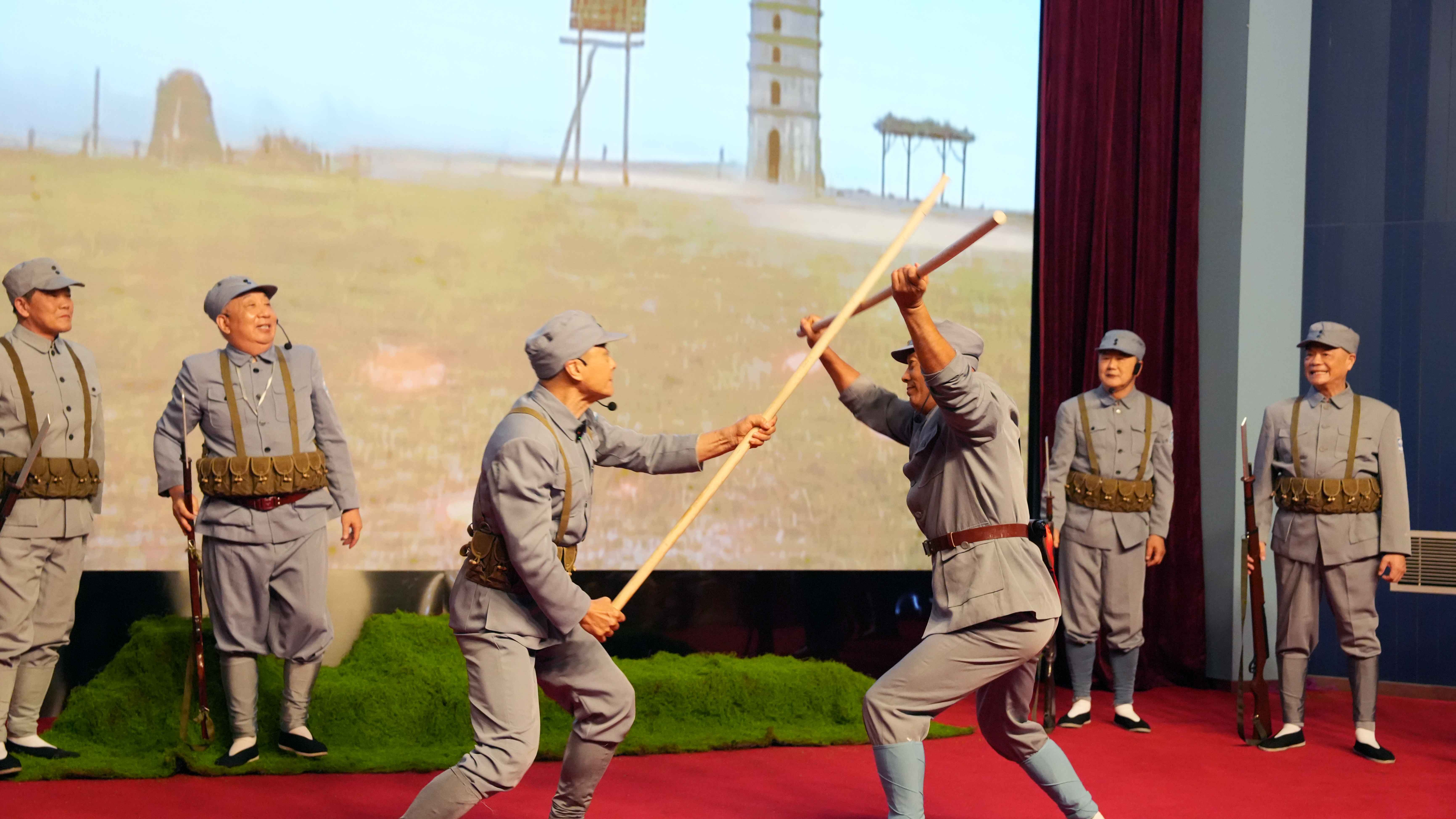 沉浸式舞台剧《大海里有条英雄的鱼》根据真实历史改编,讲述了1945年在江苏高邮进行的三垛河口伏击战中壮烈牺牲的抗日英雄海有鱼烈士的成长故事,展现了英雄所在部队的精神风貌。特别令人感动的是,参演人员多为复转军人,他们并非专业演员,而是从2021年剧社成立时起就在金陵图书馆坚持排练的文化志愿者们。这支平均年龄68岁的特殊演出团队中,最年长者已达76岁高龄,他们将对革命先烈的崇敬之心和对人民军队的深厚感情都融入在了表演之中。