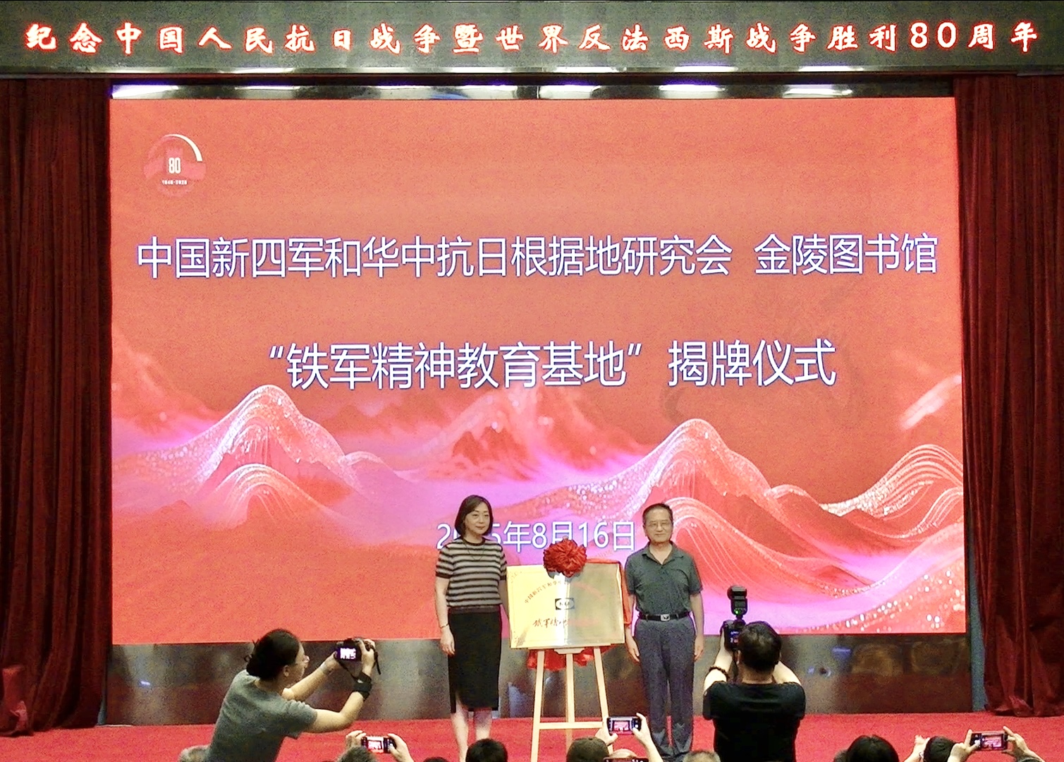 本场活动的指导单位中国新四军和华中抗日根据地研究会,是在全国有着重大影响的群众性学术团体,在研究宣传新四军历史、华中抗日根据地历史和“铁军精神”方面发挥了主力军作用。现场,中国新四军和华中抗日根据地研究会副会长刘春灏向金陵图书馆授予“铁军精神教育基地”牌匾,杨峥副馆长代表金陵图书馆表示感谢,双方共同揭牌。