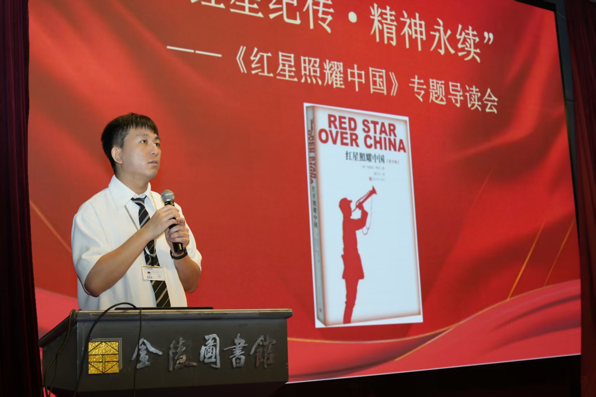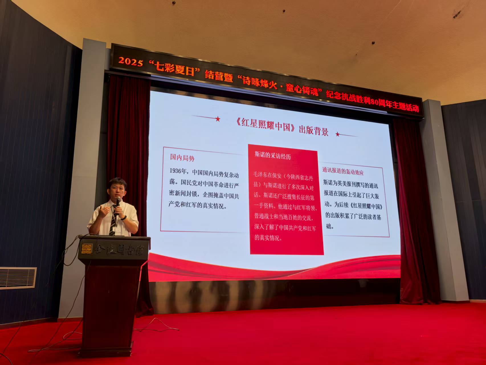 2025年8月24日上午,金陵图书馆在报告厅举办了一场以“红星纪传·精神永续”为主题的抗战胜利80周年专题导读会。本次活动由金陵图书馆少儿工作部馆员程通主讲,以经典读物《红星照耀中国》为核心,通过趣味问答、视频展播和图书讲解三大环节,为在场的小读者们生动解读了一段波澜壮阔的革命历史。