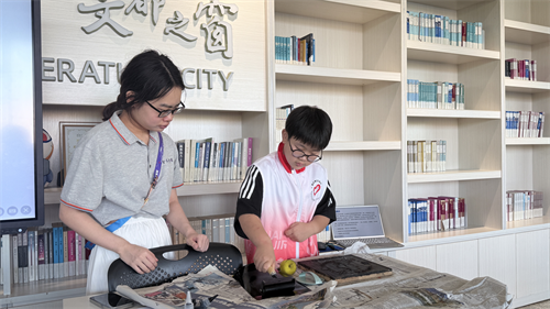在水质检测实验环节,同学们在馆员老师的指导下,运用“看-闻-测”三步法,对向阳河水、自来水及苏打水三类样本进行溶解氧、氨氮含量及pH值的对比分析;在非遗技艺体验版块,馆员老师采用废旧纸张开展雕版印刷教学,在制作“科学的南京”限定版logo的过程中,探讨传统造纸工艺与水环境保护的问题。