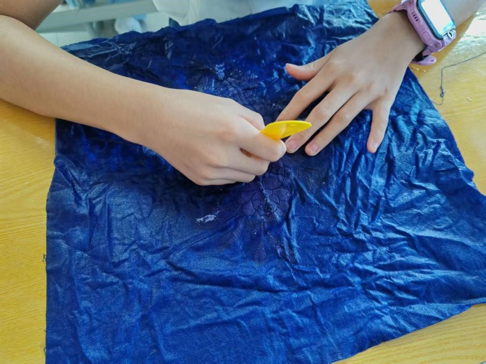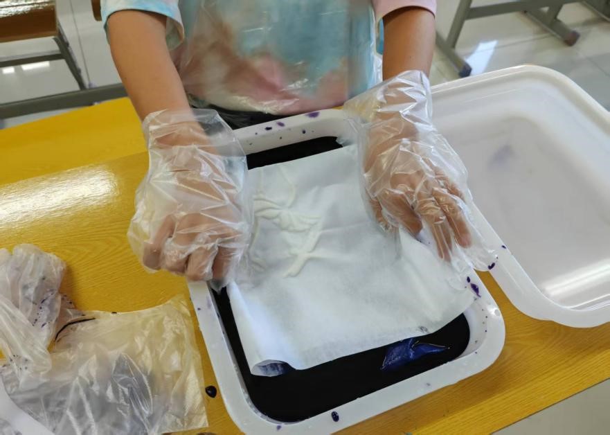 考虑到环保原因,本次课程选用黄豆粉和石灰粉来代替蜂蜡,先将黄豆粉和石灰粉与水搅拌呈糊状,并将其涂在方巾上。接着将晾干后的方巾放进在染剂中浸泡15分钟左右。随后将方巾取出,洗净除蜡。最后放进固色剂中浸泡两分钟,取出后洗净晾干。