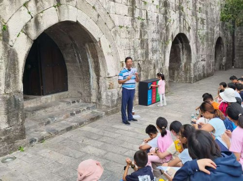 接着,仁和老师带领孩子们来到了设于城墙内部的展览厅,并向孩子们介绍了明城墙的建筑质量管理体系。当时明城墙的每一块砖都是由全国各地运送到南京的,尤其是长江上游所产的砖,可以顺着长江省时省力地送到南京来。朱元璋为了保证城砖的烧制质量,要求制砖的每一道工序都有专人负责,而且各级监造官、烧窑匠、制砖人等等的名字都要刻在城砖上,最多的达11级。这也是为什么经历六百年风风雨雨,明城墙依然坚固如初的原因。仁和老师还向孩子们讲述了朱元璋和沈万三的“聚宝盆”的故事,以及南京城从三国时代到现代五次陷于战火的历史。