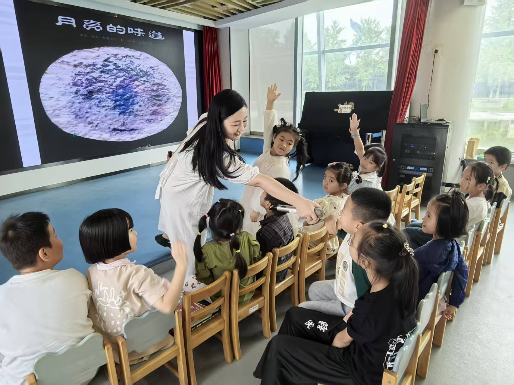 王云老师的讲述生动有趣,孩子们瞬间被故事吸引。为了尝一尝月亮究竟是什么味道,小乌龟决心爬上山顶,它请来了大象、长颈鹿、斑马……小动物们一个叠一个,搭起了高高的“动物天梯”。王老师引导孩子们观察每种动物的特点,猜测下一个会是谁来帮忙,现场化身为充满协作精神的“月光探险队”。故事的最后,小鱼提出了一个奇妙的问题:“水里不是还有一个月亮吗?为什么还要那么辛苦爬到天上?”这个充满哲理的反转,引发了孩子们热烈的思考和讨论。