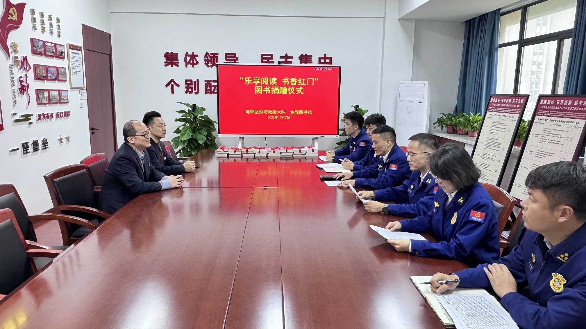 在慰问交流中,尹士亮馆长首先代表图书馆向建邺区消防救援大队在消防建设、安全生产给予的指导与支持,表示衷心感谢和崇高敬意。随后,他指出金图将持续发挥社会教育职能并推动“书香红门”高质量发展,不断提供优质文化资源,丰富文化服务方式,为广大指战员提供更多更好的精神食粮。同时,他表示图书馆愿为消防指战员和社会公众架起一座沟通的“桥梁”,通过开展形式多样的消防安全科普活动,提高全民消防安全意识。