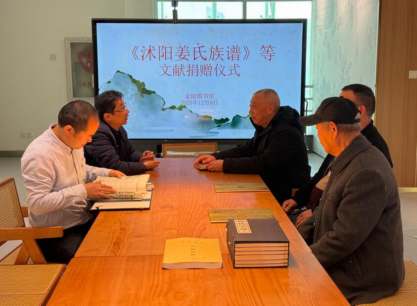 2025年12月9日,一批承载沭阳姜氏家族历史记忆的珍贵文献正式入藏金陵图书馆。此次捐赠由沭阳姜氏渭水堂族谱常务理事会发起,多位姜氏族人共同参与,捐赠文献涵盖清代至民国时期编修的多部族谱,为地方历史与家族文化研究提供了重要实物资料。