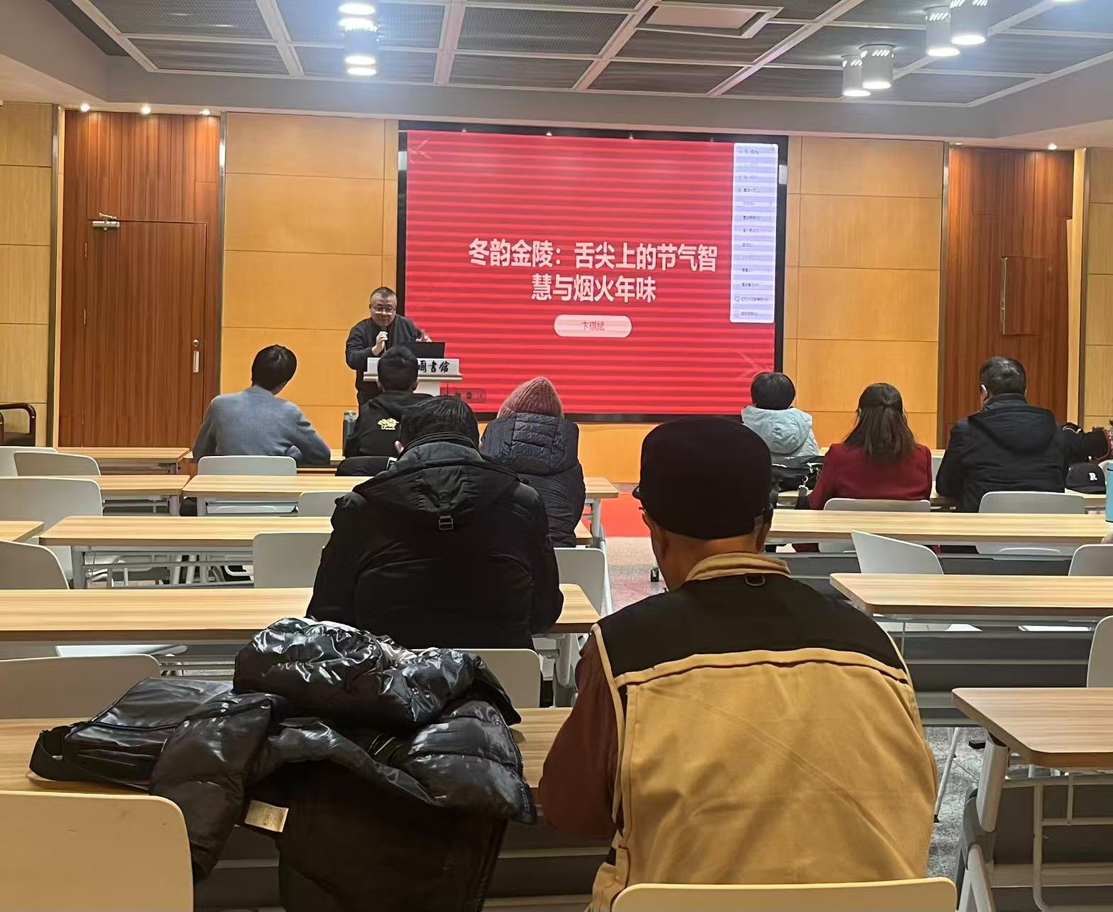 2026年2月8日下午,由金陵图书馆主办的南京文史系列讲座"冬韵金陵"文化对谈活动在多功能厅成功举办。本次活动以"舌尖上的节气智慧与烟火年味"为主题,特邀南京老门西文化守望者协会理事、公众号"凤凰台上"主编卞琪斌先生担任主讲嘉宾,与现场读者共同探寻金陵冬日食俗背后的文化内涵与养生智慧。