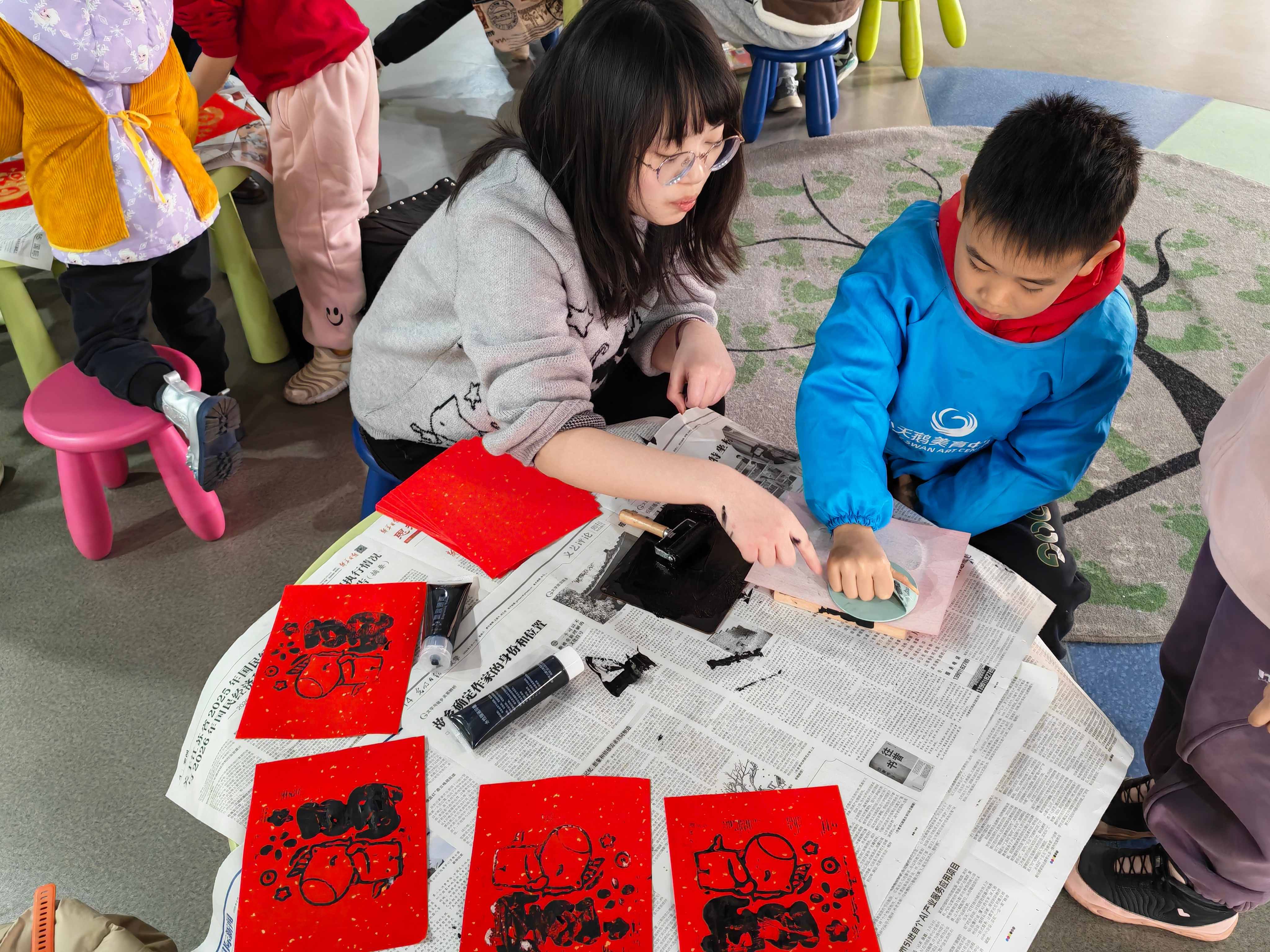 活动伊始,小读者们洗净双手,在老师的示范下,依次完成上色、印刷等步骤。当寓意吉祥的马年“福”字图案在洒金红纸上慢慢浮现,小读者们的眼神中满是成就感与好奇心。在老师的指导下,同学们亲手尝试用现代印刷工具材料制作雕版印刷品,感受传统技艺的独特乐趣,现场气氛活跃。