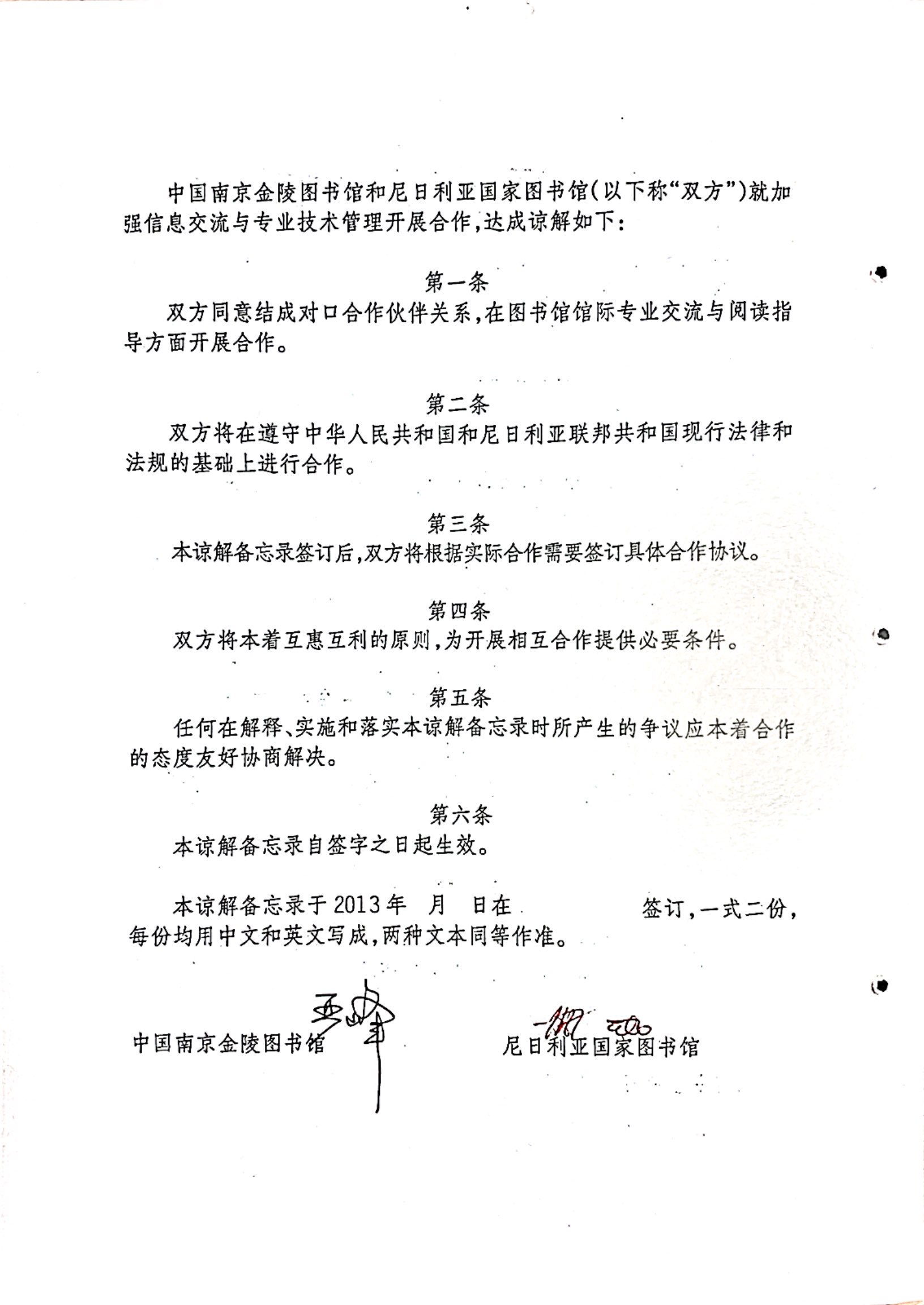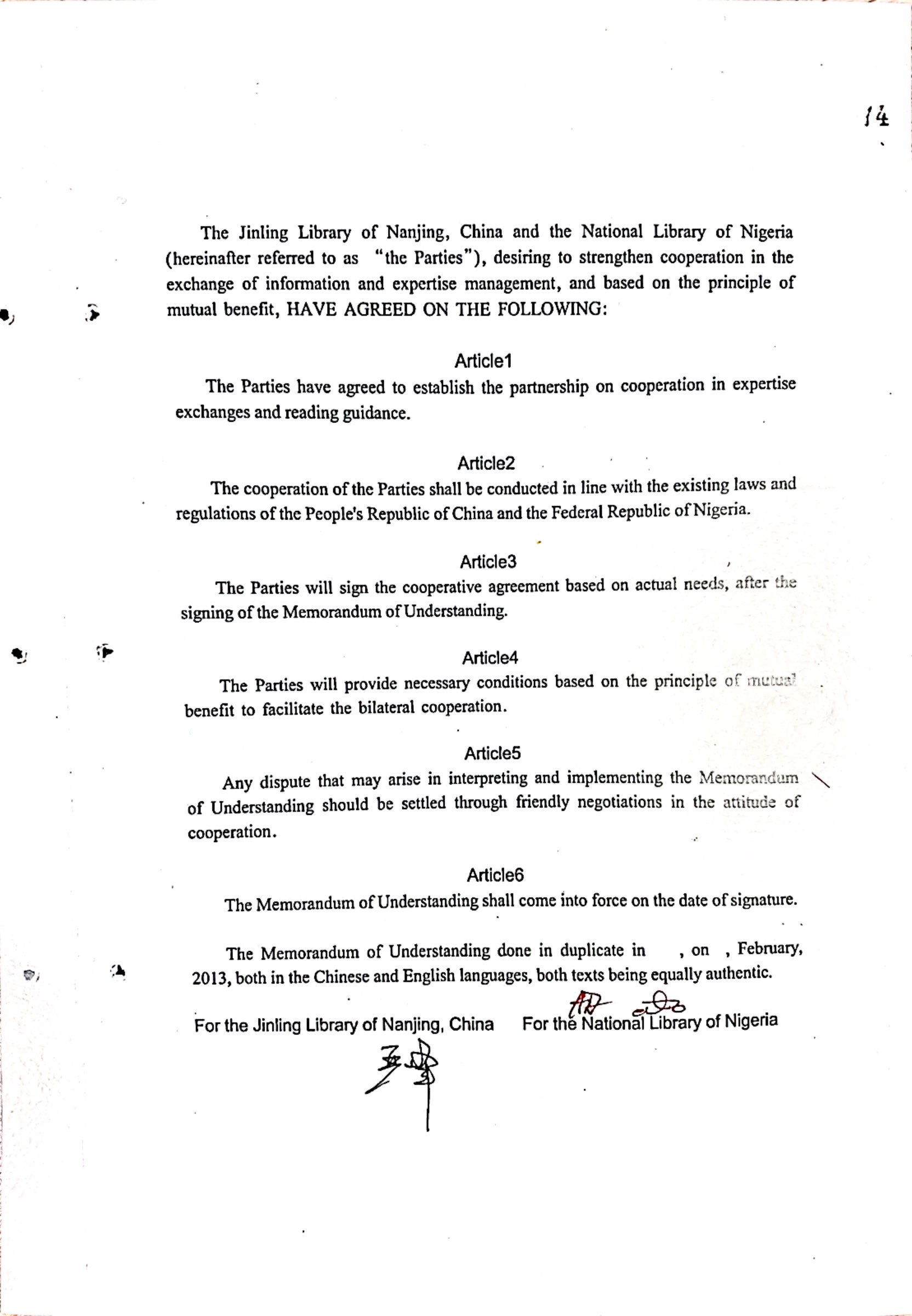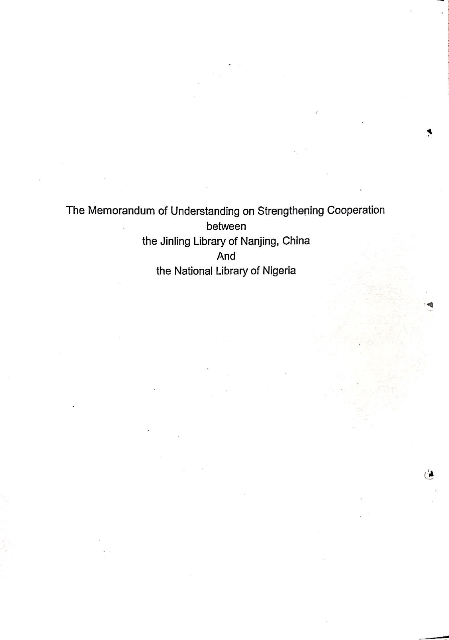 附:《中国南京金陵图书馆和尼日利亚国家图书馆关于加强相互合作的谅解备忘录》(中英版)