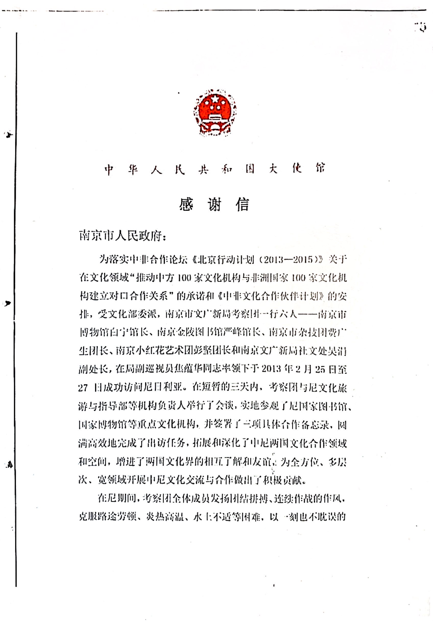 2013年2月21日至3月5日,受国家文化部委派,金陵图书馆馆长严峰作为南京市文化考察团成员,赴尼日利亚、加纳、科特迪瓦三国进行友好交流访问。其中,于2013年2月25日抵达尼日利亚首都阿布贾,与尼政府部门官员举行会谈,并与尼日利亚国家图书馆签署了双边友好文化交流谅解备忘录。