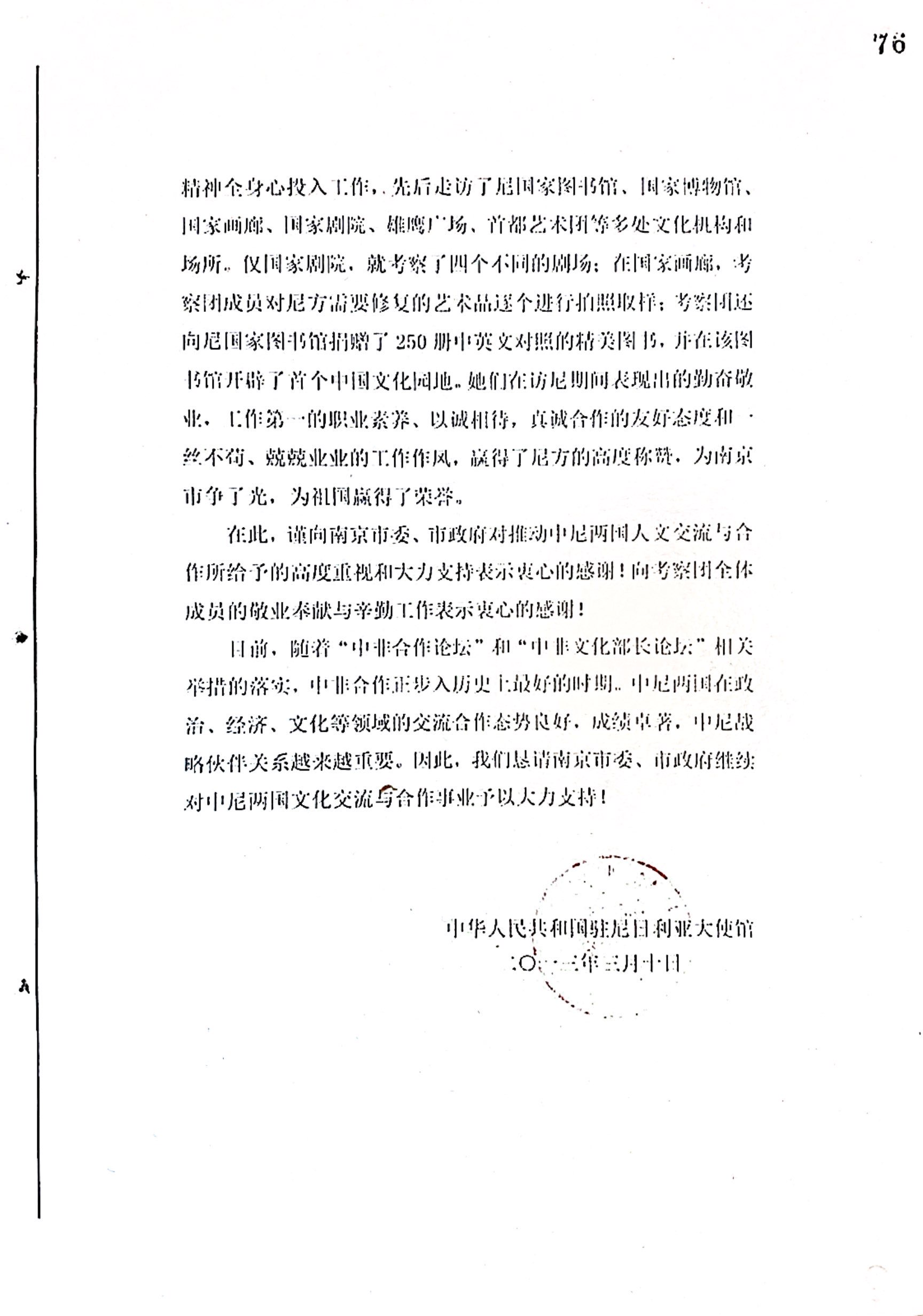 在尼国家图书馆,金陵图书馆馆长严峰和尼日利亚国家图书馆馆长贾托共同主持了图书赠送仪式。金陵图书馆向尼日利亚国家图书馆赠送了250本中国近期出版的英文图书,内容主要包括中国经典文学名著、中国知名作家著作、介绍南京的著作以及儿童文学著作,希望通过与尼方的合作,在尼国家图书馆中设立“中国图书之窗”的形式,让尼日利亚人民更了解中国,用知识的力量带动文化的交流,促进中尼友谊深入发展。