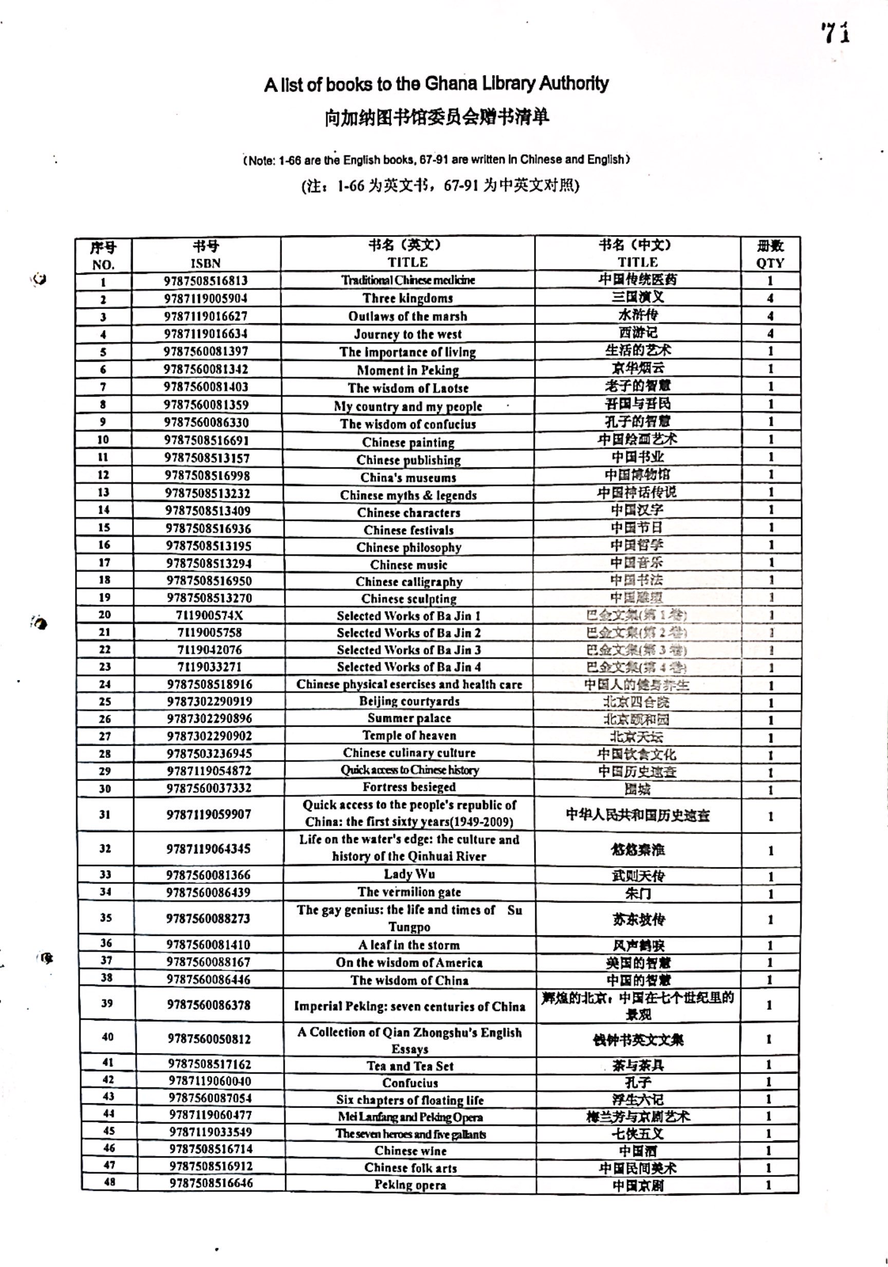 金陵图书馆此次首批向加纳图书馆委员会赠送了100本中国近期出版的英文图书,内容主要包括中国经典文学名著、中国知名作家著作、介绍南京的著作以及儿童文学著作。加纳教育部副部长亚历克斯(Hon. Alex Kyeremeh)和中国龚建忠大使出席了签字仪式。在图书赠送仪式上,严峰馆长表示,希望通过与加方的合作,在加纳图书馆中设立“中国图书之窗”的形式,让加纳人民更了解中国,用知识的力量带动文化的交流,促进中国加纳人民友谊深入发展。