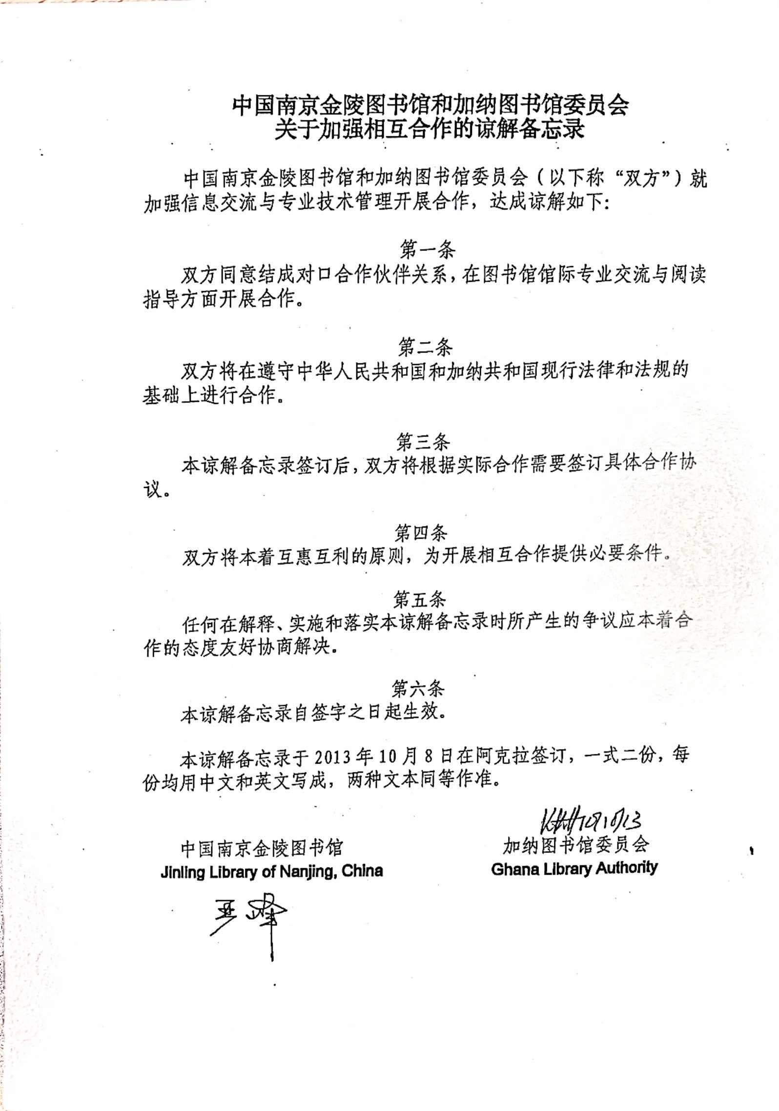 附:《中国南京金陵图书馆和加纳图书馆委员会关于加强相互合作的谅解备忘录》(中英版)
