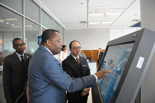 加科索部长对我馆优美的场馆环境、先进的服务设施和深厚的文化底蕴极为赞赏,并饶有兴趣地观看了高效便捷的自动化图书借还管理系统和电子阅报机的操作演示。
