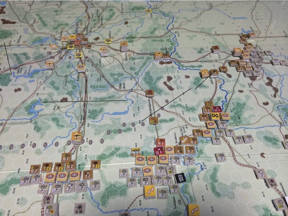 反证法同样可以用于大战术兵棋以及战役兵棋中。以著名的战役兵棋战役作战系列OCS为例,OCS的补给系统看上去非常不错,因为它给出了具象化的补给物资,称为SP,1SP约等于1500吨补给物资。玩家在执行特定行动的时候,如装甲师移动、战斗、建设、炮兵轰炸会消耗SP。一切看上去都井井有条非常美好。但是随着玩家对于OCS策略的解构,已经把OCS的推演方式推向了一个极端。使得OCS完全成为了一个少数人的战争。比如在OCS系列中的著名作品古德里安闪击战Ⅱ,表现的是德军中央集团军在1941年底进攻莫斯科的台风行动。在熟练的德军玩家手里,德军90%以上的SP都被20个左右装甲师、摩步师在进攻中消耗掉了,而剩下40余个步兵师仅仅花费了5%左右的SP,而且他们几乎永远都在承担防守任务,从不发起主动进攻,这是完全不符合现实情况的。