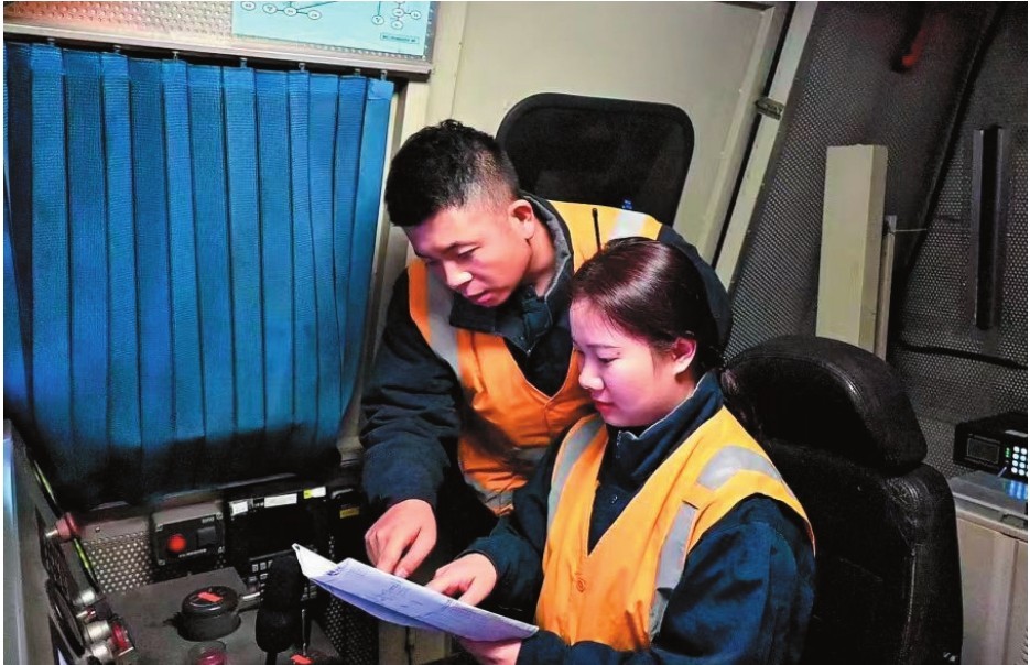 在仅三平方米的大机驾驶室内,仪表盘指针跃动如星,拨杆按键星罗棋布。我坐于前位操控,佘建华守在后位辅助,通过对讲机传递着默契。我跟佘建华搭档5年了。白天列车在线路上跑,夜晚我们要对线路进行检修。我们两人分工明确,一人精准操控钢铁巨兽,一人细致检查设备、确认仪表、核对资料。繁复的施工流程,在我们行云流水的配合中,化为一曲和谐的乐章。